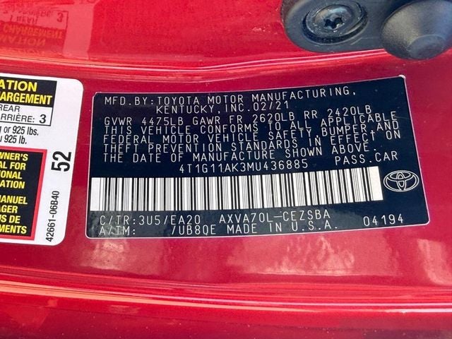 Recent Arrival! Red Toyota Camry A MUST SEE!! ** 4-Wheel Disc Brakes **, ** 6 Speakers **, ** ABS brakes **, ** Air Conditioning **, ** All-Weather Floor Liner Package (TMS) **, ** Alloy wheels **, ** AM/FM radio: SiriusXM **, ** Apple CarPlay/Android Auto **, ** Auto High-beam Headlights **, ** Automatic temperature control **, ** Black Out Badges (TMS) **, ** Blackout Package (TMS) **, ** Blind Spot Monitor w/Rear Cross Traffic Alert **, ** Brake assist **, ** Bumpers: body-color **, ** Delay-off headlights **, ** Driver door bin **, ** Driver vanity mirror **, ** Dual front impact airbags **, ** Dual front side impact airbags **, ** Electronic Stability Control **, ** Emergency communication system: Safety Connect with 1-year trial **, ** Exterior Parking Camera Rear **, ** Fabric Seat Trim w/Sport SofTex **, ** Four wheel independent suspension **, ** Front anti-roll bar **, ** Front Bucket Seats **, ** Front Center Armrest **, ** Front reading lights **, ** Fully automatic headlights **, ** Heated Exterior Mirrors w/Turn Signal Indicators **, ** Illuminated entry **, ** Knee airbag **, ** Low tire pressure warning **, ** Mudguards (TMS) **, ** Occupant sensing airbag **, ** Outside temperature display **, ** Overhead airbag **, ** Overhead console **, ** Panic alarm **, ** Passenger door bin **, ** Passenger vanity mirror **, ** Power door mirrors **, ** Power driver seat **, ** Power steering **, ** Power Tilt/Sliding Moonroof **, ** Power windows **, ** Radio data system **, ** Radio: AM/FM Audio System **, ** Rear anti-roll bar **, ** Rear Bumper Applique (Black) (TMS) **, ** Rear seat center armrest **, ** Rear side impact airbag **, ** Rear window defroster **, ** Remote keyless entry **, ** Rocker Applique (TMS) **, ** Security system **, ** Speed control **, ** Speed-sensing steering **, ** Split folding rear seat **, ** Spoiler **, ** Steering wheel mounted audio controls **, ** Tachometer **, ** Telescoping steering wheel **, ** Tilt steering wheel **, ** Traction control **, ** Trip computer **, ** Variably intermittent wipers **, ** Wheels: 8.0J x 18 Black Machined-Finish Alloy **.